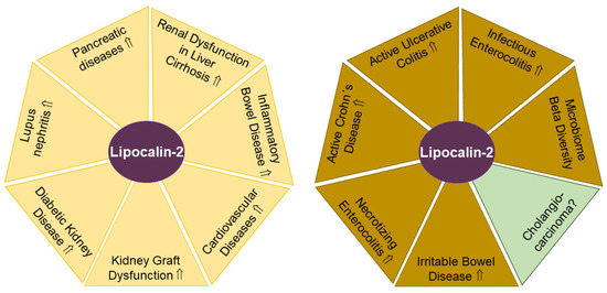 Lipocalin-2 levels in urine (yellow areas) and feces (light brown areas) have potential to serve as biomarkers for the indicated diseases. In cholangiocarcinoma (green) with altered biliary lipocalin-2 levels, the diagnostic and prognostic value of fecal lipocalin-2 remains to be clarified. Elevated (⇑) lipocalin-2 levels and a lack of data on lipocalin-2 amounts (?) in urine or feces in patients compared to the respective controls are indicated.