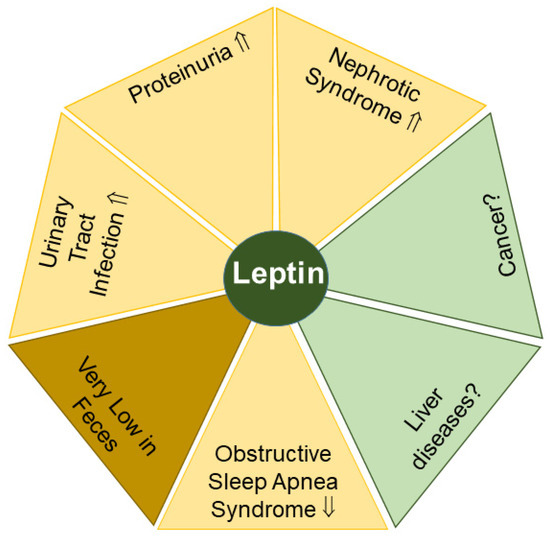 Leptin levels in urine (yellow) may serve as possible biomarkers for the indicated diseases. Significant amounts of leptin in feces (light brown) are difficult to detect. Elevated (⇑) and reduced (⇓) leptin levels and a lack of data (?) on leptin levels in urine or feces in patients compared to the respective controls are indicated.