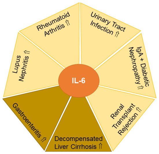 - El-Shereef, R.R.; Lotfi, A.; Abdel-Naeam, E.A.; Tawfik, H. Serum and Urinary Interleukin-6 in Assessment of Renal Activity in Egyptian Patients with Systemic Lupus Erythematosus. Clin. Med. Insights Arthritis Musculoskelet Disord. 2016, 9, 29–36. [Google Scholar] [CrossRef]