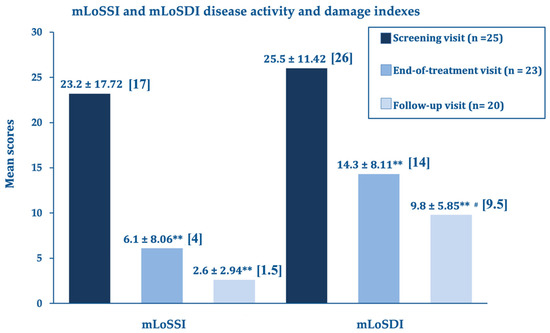 Localized Scleroderma Cutaneous Assessment (LOSCAT) subscore analysis: mean changes ± standard deviation and medians of the mLoSSI disease activity and mLoSDI disease damage indexes; end-of-treatment visit (day 90) and follow-up visit (day 180) vs. screening visit (baseline). ** p < 0.0001 vs. baseline screening visit, # p = 0.030 vs. day 90.