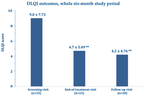 Mean Dermatology Life Quality Index (DLQI) score changes ± standard deviation after 90 (end-of-treatment visit) and 180 days (follow-up visit) vs. baseline (screening visit). ** p = 0.0002 vs. screening visit.