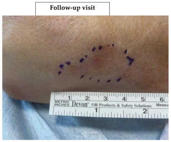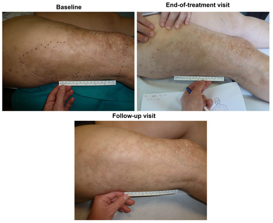 Photographs were taken at a distance of 20 to 30 cm of the patient’s fibroatrophic skin lesions to record dimensions, calculated area (mm2, millimeter ruler), and location.