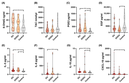 Violin plots of significant analytes discriminating DU, DO-DU patients, and controls. DU, detrusor underactivity. (A) Urine 8-OHdG levels, (B) Urine TAC levels, (C) Uriine PGE2 levels, (D) Urine EGF levels, (E) Urine IL-5 levels, (F) Urine IL-8 levels, (G) Urine IL-10 levels, (H) Urine CXCL10 levels; DO-DU, detrusor overactivity and detrusor underactivity; 8-OHdG, 8-hydroxy-2-deoxyguanosine; TAC, total antioxidant capacity; PGE2, prostaglandin E2; EGF, epidermal growth factor; CXCL10, chemokine (C-X-C motif) ligand 10. * p < 0.05, ** p < 0.01.