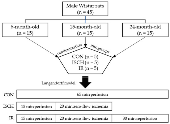 Schematic representation of the experimental protocol. A model of myocardial ischemia and reperfusion using rats of three age groups and subdivided into control group (CON), ischemic group (ISCH), and ischemia-reperfusion group (IR).