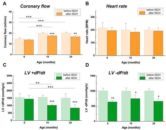Effect of IR on contractile function parameters during aging. Individual parameters are presented as (A) coronary flow, (B) heart rate, (C) LV +dP/dt (maximum rate of pressure development), and (D) LV −dP/dt (maximum rate of relaxation). Values are expressed as mean ± SD of 5 hearts per each experimental group, * p < 0.05, ** p < 0.01, *** p < 0.001, significantly different when compared to the preischemic value, or ++ p < 0.01, +++ p < 0.001, significantly different when compared between age groups.
