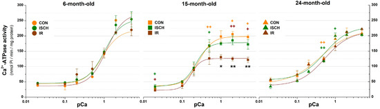 Calcium dependence of Ca2+-ATPase activity during aging in CON, ISCH, and IR groups. The nonlinear least-squares method with Hill fitting was used for the graphical interpretation of Ca2+ dependence. Values are expressed as mean ± SD of 5 hearts per each experimental group. * p < 0.05, ** p < 0.01, significantly different when compared to the CON, or + p < 0.05, ++ p < 0.01, significantly different when compared between age groups.