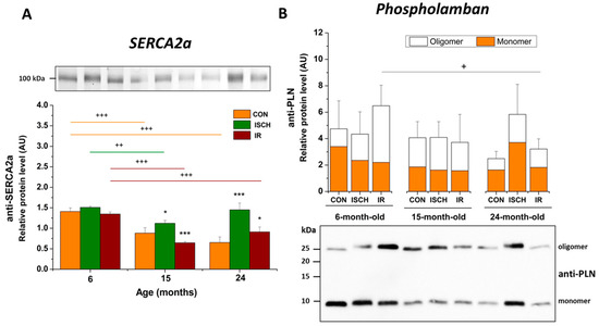 The relative protein levels of (A) SERCA2a and (B) PLN after IR in aged hearts. The total PLN amount is presented as the sum of PLN monomers and oligomers. Values are expressed as mean ± SD of 3 hearts per each experimental group. * p < 0.05, *** p < 0.001, significantly different when compared to the CON, or + p < 0.05, ++ p < 0.01, +++ p < 0.001, significantly different when compared between age groups. SERCA2a (SR/ER Ca2+-ATPase), PLN (phospholamban).