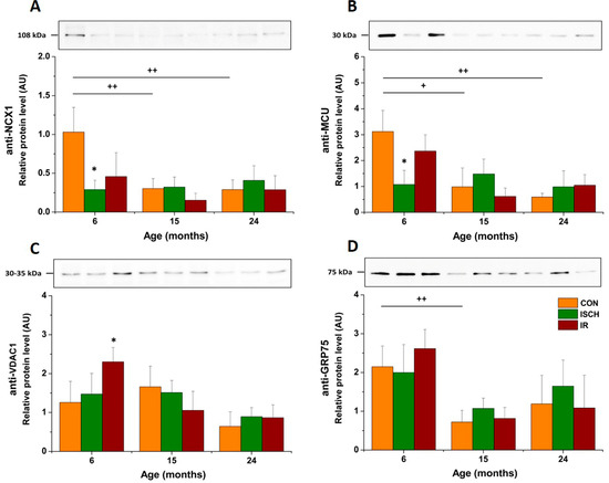 Representative Western blots with the relative protein levels of NCX1 (A), MCU (B), VDAC1 (C), and GRP75 (D) after IR in aged hearts. Values are expressed as mean ± SD of 3 hearts per each experimental group. * p < 0.05, significantly different when compared to the CON, or + p < 0.05, ++ p < 0.01, significantly different when compared between age groups. NCX1 (Na+/Ca2+ exchanger), MCU (mitochondrial Ca2+ uniporter), VDAC1 (voltage-dependent anion channel 1), GRP75 (glucose-regulated protein 75).