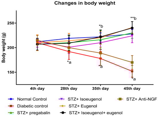 | STZ + isoeugenol | 2.22 ± 0.09 | 2.22 ± 0.04 *,b | 2.18 ± 0.05 *,b | 1.94 ± 0.14 *,b |