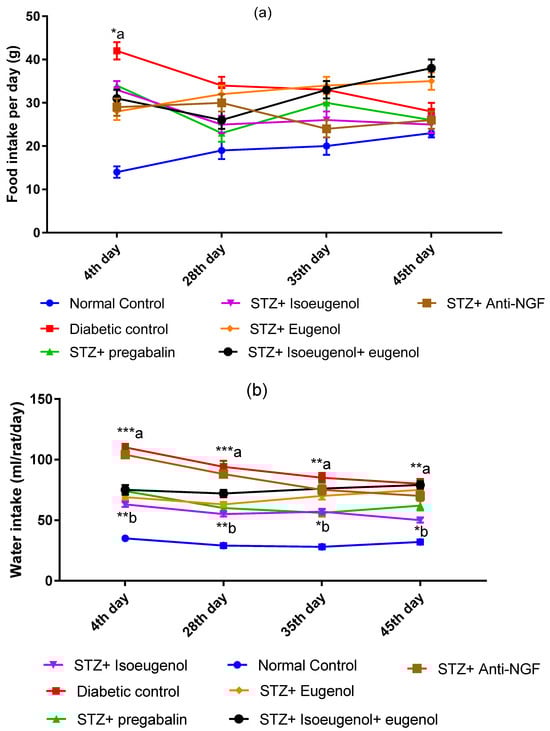 | STZ + isoeugenol + eugenol | 1.69 ± 0.05 *,b | 2.93 ± 0.05 *,b | 3.08 ± 0.05 *,b | 2.36 ± 0.16 *,b |