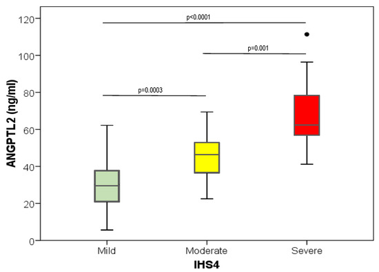 Box and whisker plot representing the serum ANGPTL2 levels in the different HS patients’ groups, according to the HS patients’ severity score (IHS4). Significant differences between groups of patients are shown.