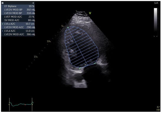 Two-dimensional echocardiography: apical two chamber view showing a severely dilated left ventricle along with a severely impaired LVEF; the top left of the picture showing the aforementioned measurements (biplane results).