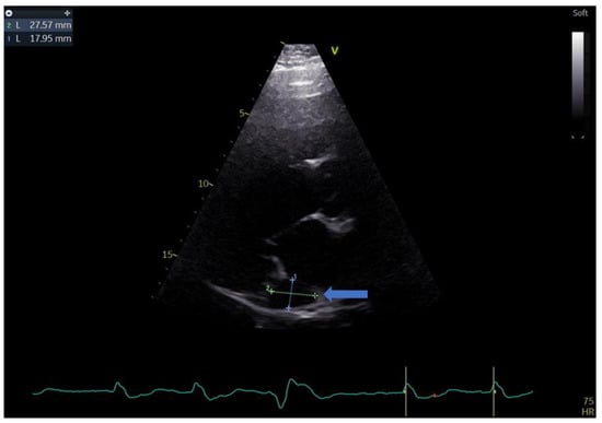 Parasternal long-axis view showing the measurements of the coronary sinus (blue arrow).