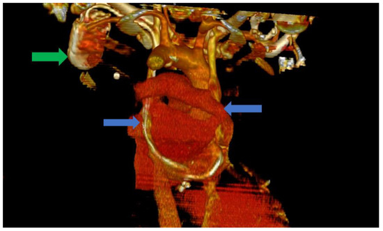 Computer tomography of the heart ang large vessels; in this scenario, a posterior view is provided. We can clearly observe the two superior vena cava (blue arrows) that do not have any communicating branches. In addition, the impulse generator and the adjacent leads can be observed (green arrow).