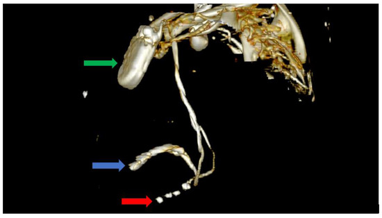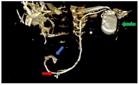 Computer tomography showing a left lateral view with the soft tissue removed from the image, as well as most of the skeleton. The image clearly shows the impulse generator (green arrow), the right ventricular lead implanted in the right ventricle forming a loop (blue arrow), as well as the tetrapolar CS lead adjacent to the right ventricle; the lead had migrated from its initial position in the CS (red arrow).