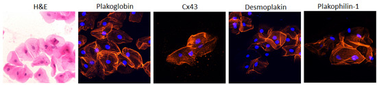 Representative confocal immunofluorescence images of buccal epithelial cells obtained from healthy controls. In the first image, cells are stained with hematoxylin and eosin (H&E). They show the typical squamous morphology; they have small central nuclei; and their edges are clearly identified. The remaining images show control buccal cells immunostained for plakoglobin, Cx43, desmoplakin and PKP1. The immunoreactive signal for all four proteins is strong and clearly localizes at the cell borders. Cell nuclei (blue) were stained with DAPI [59].