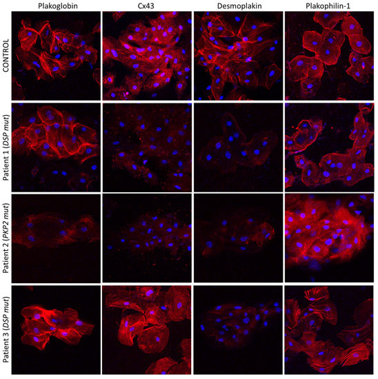 The buccal mucosa consists of flattened, squamous cells with small central nuclei and clearly identifiable edges. In normal subjects, these cells show strong membrane immunofluorescent signal for PG, DSP, Cx43 and plakophilin-1 (PKP1, Figure 1). PKP1 is one of the three plakophilin isoforms. It is primarily expressed in the upper epithelia. Conversely, PKP3 is primarily found in the lower epithelia, while PKP2 is the isoform expressed in the heart [59].