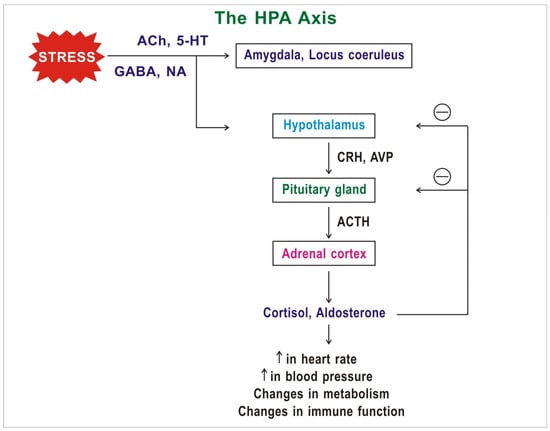 The central pathway that takes part in the response to stress is the hypothalamic–pituitary–adrenal (HPA) axis (Figure 1). In 1914 the noted American physiologist Walter Cannon proposed the “fight or flight” model, which describes the body’s response to stress []. In the 1950s the Hungarian-Canadian endocrinologist Hans Selye proposed general adaptation syndrome, according to which chronic stress can induce a nonspecific response in the body, such as increased heart rate and blood pressure []. During stress, the amygdala, hypothalamus, and parts of the brain stem such as the locus coeruleus, which make up the central parts of the stress response, are activated [].
