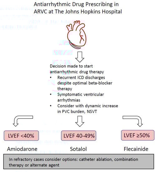 Arrhythmogenic right ventricular cardiomyopathy (ARVC) is a heritable myocardial disorder that is characterized by the progressive replacement of ventricular myocardium with fibrofatty scar tissue, which predisposes patients to ventricular arrhythmias and sudden cardiac death (SCD) []. ARVC predominantly affects the right ventricle and is a major cause of SCD in young people and athletes. Treatment of the condition has focused on slowing disease progression, reducing the burden of arrhythmias and the prevention of SCD. Available therapies comprise lifestyle changes, implantable cardioverter-defibrillator (ICD) placement, catheter ablation and the use of antiarrhythmic medications []. Antiarrhythmic drugs (AAD) are important adjuncts to ICD placement and catheter ablation in reducing the morbidity associated with ventricular arrhythmias and ICD shocks in patients with refractory arrhythmias. Catheter ablation can be effective in treating malignant arrhythmias in the short-term, but given the progressive nature of the condition, ventricular arrhythmias often recur, necessitating the use of single or combination adjunctive drug therapy to suppress arrhythmias []. The aims for this review are threefold: reviewing the current literature and evidence for AAD use in ARVC, detailing the current practice of AAD therapy at Johns Hopkins Hospital based on over 25 years of clinical experience and identifying areas where further research is needed.