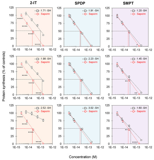 Altogether these results suggested that, at all the tested conditions and for all the reagents, derivatized saporin maintained EC50 values in the pM range.