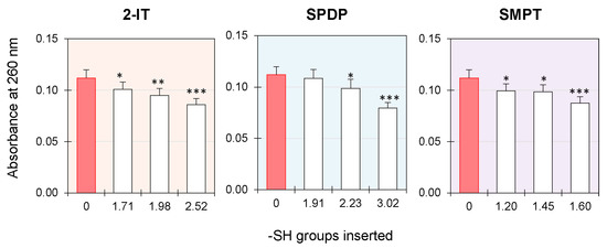 The molar concentration of inserted -SH groups was calculated as reported in step 1, Table 2, considering that the molar extinction coefficient at 343 nm of pyridine-2-thione, (ε343(pyridine-2-thione)), is 8080 L cm−1 M−1 [31].