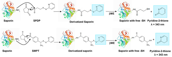 Derivatization reaction of saporin with SPDP or SMPT. Saporin was derivatized with SPDP or SMPT to insert protected -SH groups. The reduction with β-mercaptoethanol (βME) produces saporin with free -SH groups and pyridine-2-thione, whose concentration was determined by measuring the absorbance at 343 nm.