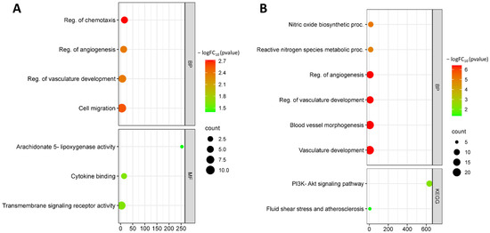 Functional enrichment analysis by biological processes showed that up-regulated DEGs under OS are involved in biological processes such as the regulation of chemotaxis (GO:0050920), chemotaxis (GO:0006935), regulation of angiogenesis (GO:0045765), vasculature development (GO:0001944), and cell migration (GO:0016477). Up-regulated DEGs are involved in molecular functions such as arachidonate 5-lipoxygenase activity (GO:0004051), cytokine binding (GO:0019955), immune receptor activity (GO:0140375), and transmembrane signaling receptor activity (GO:0004888) (Figure 2A).