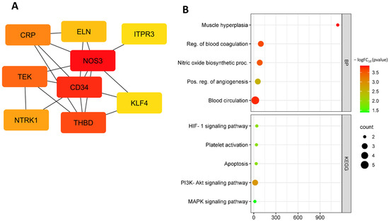 Further analysis identified the following down-regulated hub DEGs: CRP, TEK, NTRK1, CD34, FGF18, NOS3, KLF4, THBD, ITPR3, and ELN (Figure 3A, Table 1). Down-regulated hub DEGs are involved in biological processes such as the regulation of muscle hyperplasia (GO:0014738), negative regulation of blood coagulation (GO:0030195), positive regulation of angiogenesis (GO:0045766), blood circulation (GO:0008015), nitric oxide biosynthetic process (GO:0006809), blood coagulation (GO:0007596), and response to fluid shear stress (GO:0034405 (Figure 3A)). Down-regulated hub DEGs are involved in KEGG pathways such as hypoxia-inducible factor-1 (HIF-1) signaling pathway (hsa04066), inflammatory mediator regulation of TRP channels (hsa04750), platelet activation (hsa04611), apoptosis (hsa04210), fluid shear stress and atherosclerosis (hsa05418), ATP-binding cassette (ABC) transporters (hsa02010), PI3K-Akt signaling pathway (hsa04151), and mitogen-activated protein kinase (MAPK) signaling pathway (hsa04010) (Figure 3B).