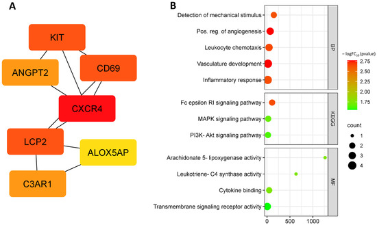 Further analysis identified the following up-regulated hub DEGs: ALOX5AP, ANGPT2, KIT, LCP2, C3AR1, CXCR4, and CD69 (Figure 4A, Table 2). These DEGs are involved in such biological processes as the detection of mechanical stimulus involved in sensory perception (GO:0050974), detection of mechanical stimulus (GO:0050982), leukocyte chemotaxis (GO:0030595), inflammatory response (GO:0006954), blood vessel morphogenesis (GO:0048514), myeloid leukocyte activation (GO:0002274), and leukotriene production involved in inflammatory response (GO:0002540) (Figure 4B).