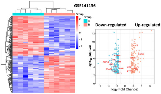 Heatmap and volcano plot for DEGs from dataset GSE141136. Note: the identified hub DEGs are shown in the volcano plot.