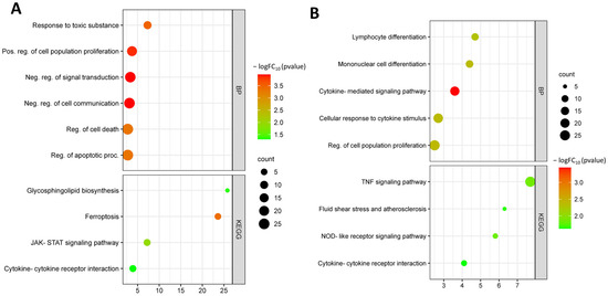 Functional enrichment analysis by biological processes showed that up-regulated DEGs were involved in biological processes such as response to toxic substance (GO:0009636), positive regulation of cell population proliferation (GO:0008284), negative regulation of signal transduction (GO:0009968), regulation of cell death (GO:0010941), and regulation of apoptotic process (GO:0042981). Up-regulated DEGs are involved in KEGG pathways such as glycosphingolipid biosynthesis (hsa00604), ferroptosis (hsa04216), cytokine–cytokine receptor interaction (hsa04060) (Figure 6A).