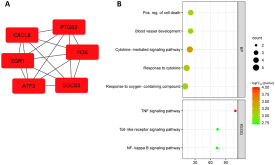 Further analysis identified the following up-regulated hub DEGs: EGR1, ATF3, CXCL8, SOCS3, FOS, and PTGS2 (Figure 7A, Table 3). Up-regulated hub DEGs are involved in the following biological processes: positive regulation of cell death (GO:0010942), blood vessel development (GO:0001568), cytokine-mediated signaling pathway (GO:0019221), cellular response to oxygen-containing compounds (GO:1901701), response to cytokine (GO:0034097), and negative regulation of cell communication (GO:0010648). Up-regulated hub DEGs are involved in KEGG pathways such as TNF signaling pathway (hsa04668), toll-like receptor signaling pathway (hsa04620), and NF-kappa B signaling pathway (hsa04064) (Figure 7B).