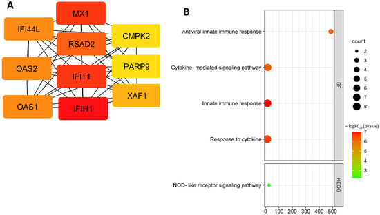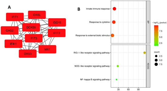 A search for up-regulated hub DEGs identified the following genes: IFIH1, IFIT1, OAS2, OAS3, DDX58, ISG15, MX1, OASL, IFIT3 and IFIT2 (Figure 11A, Table 5). Up-regulated hub DEGs are involved in biological processes such as Type I interferon signaling pathway (GO:0060337), innate immune response (GO:0045087), response to cytokine (GO:0034097), and response to external biotic stimulus (GO:0043207). Up-regulated hub DEGs are involved in KEGG pathways such as RIG-I-like receptor signaling pathway (hsa04622), NOD-like receptor signaling pathway (hsa04621), and NF-kappa B signaling pathway (hsa04064) (Figure 11B).