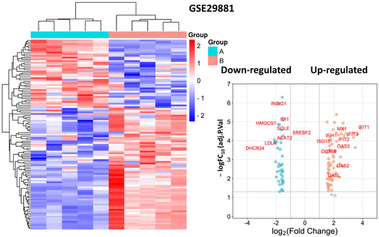 Heatmap and volcano plot for DEGs from dataset GSE29881. Note: the identified hub DEGs are shown in the volcano plot.
