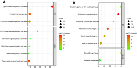 The GO analysis revealed that the up-regulated genes were mainly involved in Type I interferon signaling pathway (GO:0060337), innate immune response (GO:0045087), cytokine-mediated signaling pathway (GO:0019221), response to external biotic stimulus (GO:0043207), and response to cytokine (GO:0034097). Up-regulated DEGs are involved in KEGG pathways such as RIG-I-like receptor signaling pathway (hsa04622), toll-like receptor signaling pathway (has04620), NOD-like receptor signaling pathwahashsa04621), and chemokine signaling pathway (hsa04062) (Figure 10A).