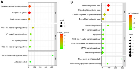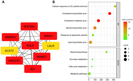 Down-regulated DEGs are involved in biological processes such as cellular response to low-density lipoprotein particle stimulus (GO:0071404), cholesterol biosynthetic process (GO:0006695), response to lipoprotein particle (GO:0055094), cholesterol metabolic process (GO:0008203), steroid biosynthetic process (GO:0006694), and lipid biosynthetic process (GO:0008610). Down-regulated DEGs are involved in KEGG pathways such as steroid biosynthesis (hsa00100) and metabolic pathways (hsa01100) (Figure 10B).