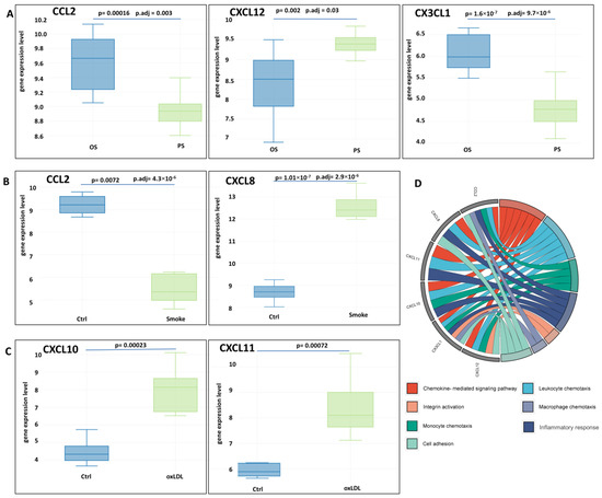 Patterns of chemokine gene expression in endothelial cells in the comparison groups ((A) GSE103672; (B) GSE141136; (C) GSE29881) associated with exposure to risk factors. (D) Gene ontology analysis by biological process for differentially expressed chemokine genes in datasets. Note: the data are visualized as box plots (A–C). Statistically significant differences (p values and p values corrected with the Benjamini and Hochberg (adj.P.Val) algorithm) are shown between comparison groups.