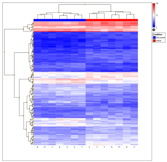 In brief, samples from eleven patients (eight male, three female) with an average age of 49 years of age at first diagnosis were analyzed. Molecular profiling confirmed all tumors were IDH1/2-wildtype, while four had MGMT promoter methylation as either low (5–10%; patients 6,11) or intermediate (10–25%; patients 7,10). Seven patient-matched pairs and four additional unmatched samples (n = 18) passed QC (Table 1). Initial and recurrent samples formed two groups in the PCA, indicating distinct transcriptional profiles (Figure S1). Stroma and immune scores were slightly higher in recurrent, but tumor purity was equivalent (p-value = 0.778; Table S1). Four of the seven patient-matched paired samples (57%) switched transcriptional subtypes after disease progression, while three remained the same, revealing no bias. RecGBM tumors were classified as mesenchymal (n = 3), proneural (n = 2), and classical (n = 3; Table S2; see Supplementary Materials). Further analysis was performed to compare transcriptional profiles of the patient-matched initial and recurrent GBM (n = 7).