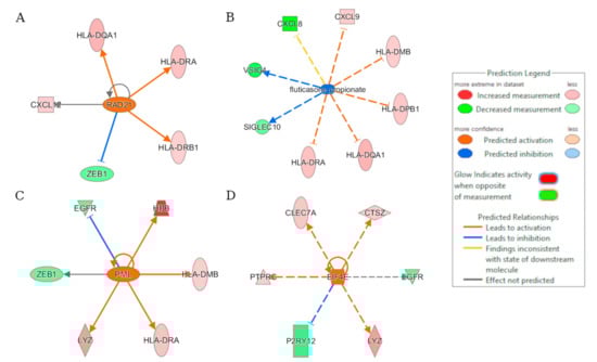 A total of 1279 upstream regulators were enriched in recGBM, linking them to activation or inhibition of gene expression. Among them, the genes (z-score), RAD21 (2.0), PML (2.162), and EIF4E (2.236) were activated, and fluticasone propionate a corticosteroid that reduces inflammation (−2.315) was inhibited in recGBM (Figure 4). RAD21 was the most significant, and its activation downregulates CXCL12, HLA-DRB1, and HLA-DQA1 and up-regulates ZEB1 resulting in the activation of the hematopoiesis of mononuclear leukocytes (Figure S4). Biological processes most significantly differentiating initial and recGBM in order were organismal injury and abnormalities (e.g., tumor growth), hematological system development and function (e.g., antigen, T-lymphocytes, mononuclear leucocytes), inflammatory response, and cancer and immune cell trafficking (see Figure S5; Supplementary Materials).