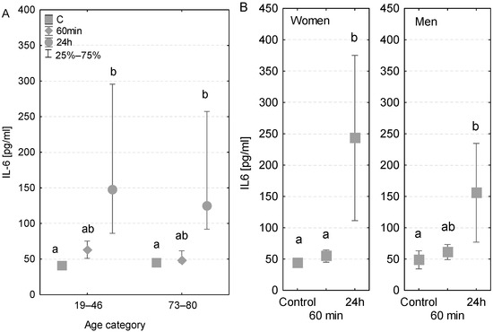 Serum IL-6 concentration (median ± quartile deviation; 25th and 75th percentiles). (A) Comparison based on the age of patients: 19–46 years and 73–80 years. (B) Comparison based on the sex of the patients. CT: measurement before the onset of CPB; 60 min: measurement at 60 min of the CPB onset; 24 h: measurement at 24 h after the onset of CPB. Values with different letters (a, b) indicate significant differences within the age or sex category (Friedman’s test or Mann–Whitney U test; p < 0.05).