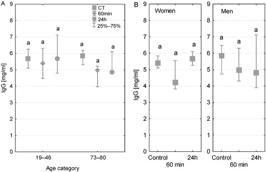 Serum IgG concentration (median ± quartile deviation; 25th and 75th percentiles). (A) Comparison based on the age of patients: 19–46 years and 73–80 years. (B) Comparison based on the sex of the patients. CT: measurement before the onset of CPB; 60 min: measurement at 60 min of the CPB onset; 24 h: measurement at 24 h after the onset of CPB. The same letters (a) indicated no statistical differences within age or sex category (Friedman’s or Mann–Whitney U test; p < 0.05.).