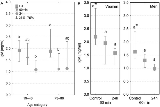 Serum IgM concentration (median ± quartile deviation; 25th and 75th percentiles). (A) Comparison based on the age of patients: 19–46 years and 73–80 years. (B) Comparison based on the sex of the patients. CT: measurement before the onset of CPB; 60 min: measurement at 60 min of the CPB onset; 24 h: measurement at 24 h after the onset of CPB. Values with different letters (a, b) indicate significant differences within the age or sex category (Friedman’s test or Mann–Whitney U test; p < 0.05); * indicates statistical difference between women and men; p < 0.05.