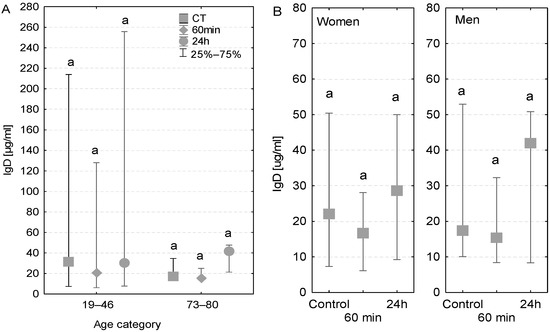 Serum IgD concentration (median ± quartile deviation; 25th and 75th percentiles). (A) Comparison based on the age of patients: 19–46 years and 73–80 years. (B) Comparison based on the sex of the patients. CT: measurement before the onset of CPB; 60 min: measurement at 60 min of the CPB onset; 24 h: measurement at 24 h after the onset of CPB. The same letters (a) indicated no statistical differences within age or sex category (Friedman’s or Mann–Whitney U test; p < 0.05.).