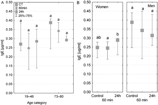 Serum IgE concentration (median ± quartile deviation; 25th and 75th percentiles). (A) Comparison based on the age of patients: 19–46 years and 73–80 years. (B) Comparison based on the sex of the patients. CT: measurement before the onset of CPB; 60 min: measurement at 60 min of the CPB onset; 24 h: measurement at 24 h after the onset of CPB. Values with different letters (a, b) indicate significant differences within the age or sex category (Friedman’s test or Mann–Whitney U test; p < 0.05).