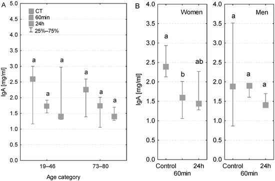 Serum IgA concentration (median ± quartile deviation; 25th and 75th percentiles). (A) Comparison based on the age of patients: 19–46 years and 73–80 years. (B) Comparison based on the sex of the patients. CT: measurement before the onset of CPB; 60 min: measurement at 60 min of the CPB onset; 24 h: measurement at 24 h after the onset of CPB. Values with different letters (a, b) indicate significant differences within the age or sex category (Friedman’s test or Mann–Whitney U test; p < 0.05).