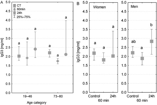 Serum IgG3 concentration (median ± quartile deviation; 25th and 75th percentiles). (A) Comparison based on the age of patients: 19–46 years and 73–80 years. (B) Comparison based on the sex of the patients. CT: measurement before the onset of CPB; 60 min: measurement at 60 min of the CPB onset; 24 h: measurement at 24 h after the onset of CPB. Values with different letters (a, b) indicate significant differences within the age or sex category (Friedman’s test or Mann–Whitney U test; p < 0.05).