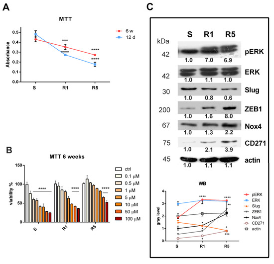 Characterization of BRAF-mutated melanoma cell line induced to resistance to vemurafenib. (A) Graph showing viability test with MTT assay measured in SK-MEL-28 cells induced or not induced to resistance with method 1 (R1) or method 2 (R5) for 12 days or 6 weeks. *** p-value < 0.001; **** p-value < 0.0001. (B) Graph showing resistance test with MTT assay measured in SK-MEL-28 cells (sensitive (S) or R1 or R5) (after 6 weeks) treated with vemurafenib from 0.1 up to 100 µM for 3 days. **** p-value < 0.0001. (C) Western blot analysis of total lysate of S, R1, and R5 SK-MEL-28 cells revealed with anti-p-ERK (R1 and R5 **** p-value < 0.0001), normalized to anti-ERK, anti-Slug (R5 * p-value < 0.05), anti-ZEB1 (R1 p-value < 0.05; R5 ** p-value < 0.01), anti-Nox4 (R1 p-value < 0.05; R5 p-value < 0.01), anti-CD-271 (R1 p-value < 0.05; R5 *** p-value < 0.001) and anti-actin, as a loading control.