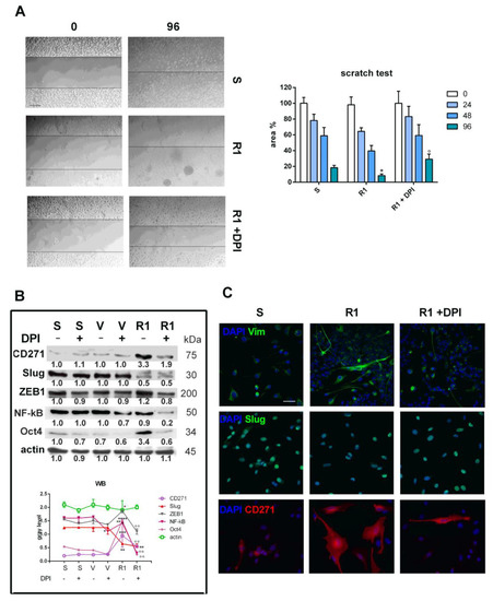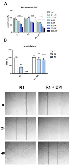 To evaluate the effect of Nox inhibition on cell migration (i.e., the capacity to disseminate and cause the metastatic process), the scratch test was performed at different time points. As shown in Figure 3A, it is notable that after 96 h, R1 cells displayed greater migration activity than S cells. More importantly, DPI was able to reduce cell migration by R1 cells at all time points but in a significant manner only after 96 h.