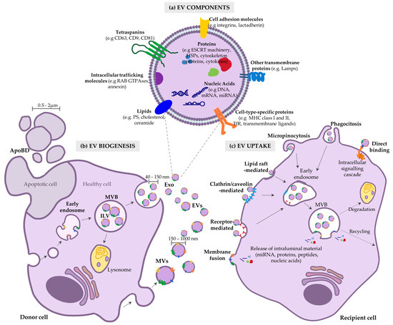 EVs are a heterogeneous population that is generally categorized into three subsets based on their biogenesis: exosomes, microvesicles and apoptotic bodies (Figure 1b) [1,2].