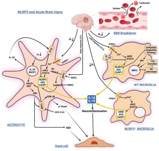 Schematic illustration of stressors and factors inducing/modulating NLRP3 inflammasome’s activation and its sequels in astrocytes and microglia under acute injuries due to hypoxic ischemia, stroke, and hemorrhage. Left: Astrocyte’s prompt response. Acute O2 tension fall activates Ca2+ influx through TPRV1 channels, triggering the JAK2/STAT3 axis and NLRP3 inflammasome activation. It also increases BACE1 and IL-33 gene expression. Over-released IL-33 binds its STD2 receptor, whose signaling mitigates NLRP3 activity. Later, BACE1 increased activity overproduces Aβs. Extracellularly released excess Aβs bind and activate CaSR signaling, which contributes to NLRP3 inflammasome activation by reducing cAMP levels and activating CaMKII. Aβ•CaSR signaling also increases BACE1 and GSK-3β activities, driving the over production of Aβs from APP and p-Taues, which are both intracellularly accumulated and extracellularly released. CaSR NAM (Calcilytic) NPS2143 and CaMKII inhibitor KN93 suppress Aβs•CaSR signaling noxious effects (see for more details Box 1). Top right: Late wild-type microglia response. The NLRP3 activation is blocked by various agents, which activate via Akt the expression of NRF2 transcription factor. NRF2 activity reduces the M1 (proinflammatory) fraction of microglia. Bottom right: In a model of NLRP3 full-knockout microglia Ca2+ influx activates in NLRP3 stead the AIM2 inflammasome’s signaling, the upshot being the same, i.e., the overproduction/release of IL-1β and IL-18 []. A yellow frame encloses the assembled inflammasomes, while nuclear envelopes are orange colored. Abbreviations: Aβs = amyloid-β peptides; AC = adenylyl cyclase; AIM2 = absent in melanoma 2 inflammasome; Akt = protein kinase B; APP = amyloid precursor protein; ASC = apoptosis-associated speck-like protein endowed with a caspase recruitment domain or CARD; BACE1 = β-secretase; BBB = blood-brain barrier; cAMP = 3′,5′-cyclic adenosine monophosphate; CASP1 = caspase-1; CaMKII = Ca2+/calmodulin-dependent protein kinase II; CaSR, calcium-sensing receptor; GdCl3 = gadolinium chloride; GSK-3β = glycogen synthase kinase-3β; JAK2 = Janus kinase 2; KN93 = N-[2-[[[(E)-3-(4-chlorophenyl)prop-2-enyl]-methylamino]methyl]phenyl]-N-(2-hydroxyethyl)-4-methoxybenzenesulfon-amide; NPS-2143 = 2-chloro-6-[(2R)-2-hydroxy-3-[(2-methyl-1-naphthalen-2-ylpropan-2-yl)amino]-propoxy]-benzonitrile; p-Taues = hyperphosphorylated Tau proteins; STAT3 = signal transducer and activator of transcription 3); STD2 = suppression of tumorigenicity 2 (receptor); TPRV1 = vanilloid type 1 receptor/channel; WT = wild-type. ↓O2 = decrease in oxygen tension. The other arrows show the sequences of molecular events induced by stressors and factors. ⊥ = inhibition.